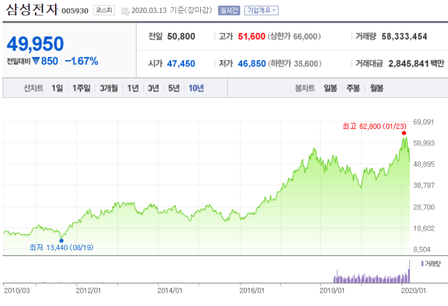 위의 사진은 삼성전자의 10년 주가 그래프이다.