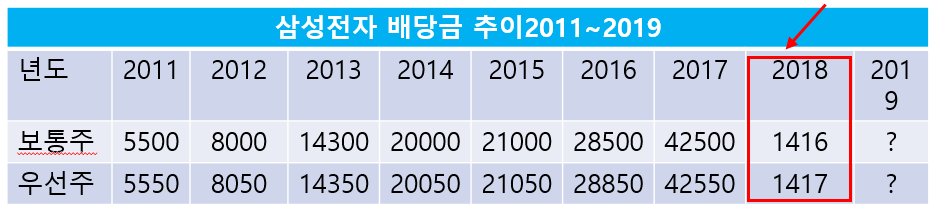 위의 표에보면 2011년부터 2019년까지의 배당금 내역이다.
